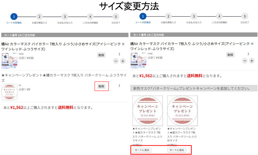 ★キャンペーンプレゼント★の右側にある「削除」ボタンを押していただくと、サイズ変更ができるようになります。