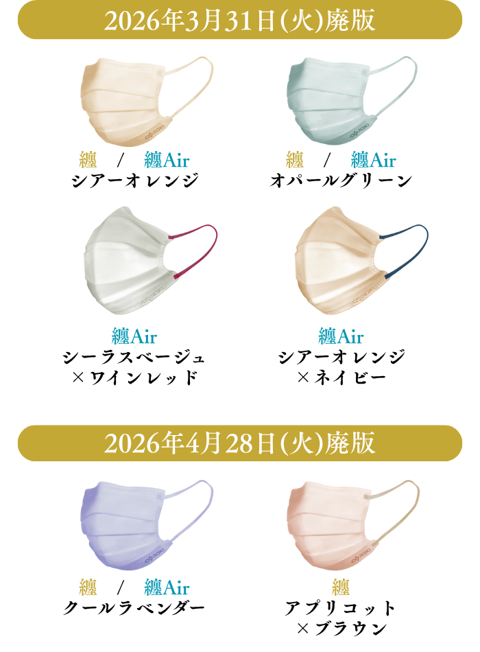 このたび、より良い商品ラインナップをご提供するため、現在展開しておりますマスクカラーのうち、下記のカラーを順次販売終了とさせていただくこととなりました。